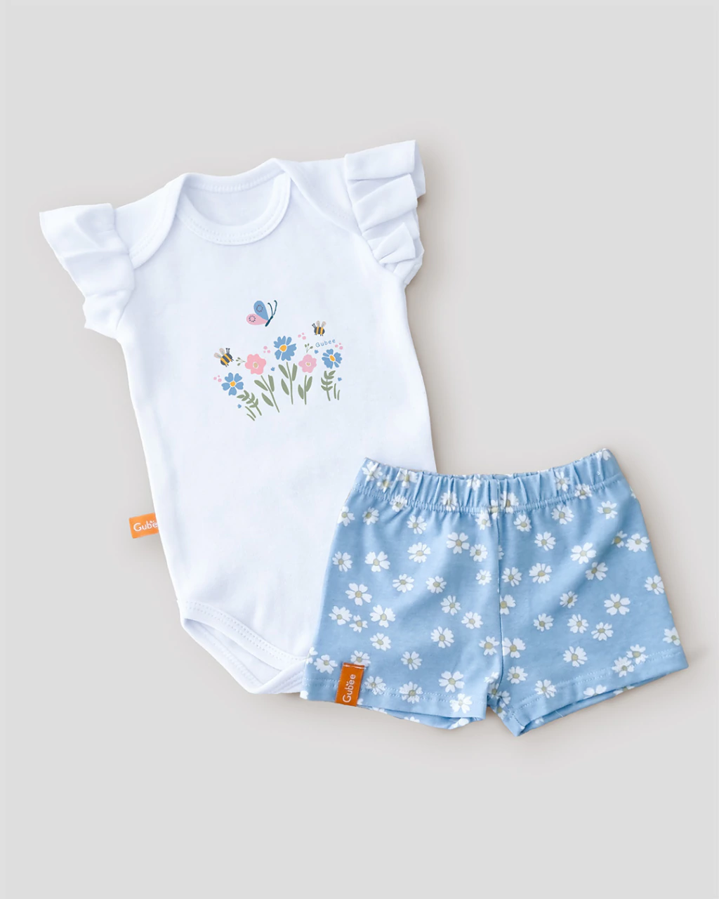Pensado para acompañar sus movimientos con suavidad y estilo, este conjunto combina la elasticidad de la lycra con la delicadeza del algodón, cuidando la piel sensible del recién nacido.
