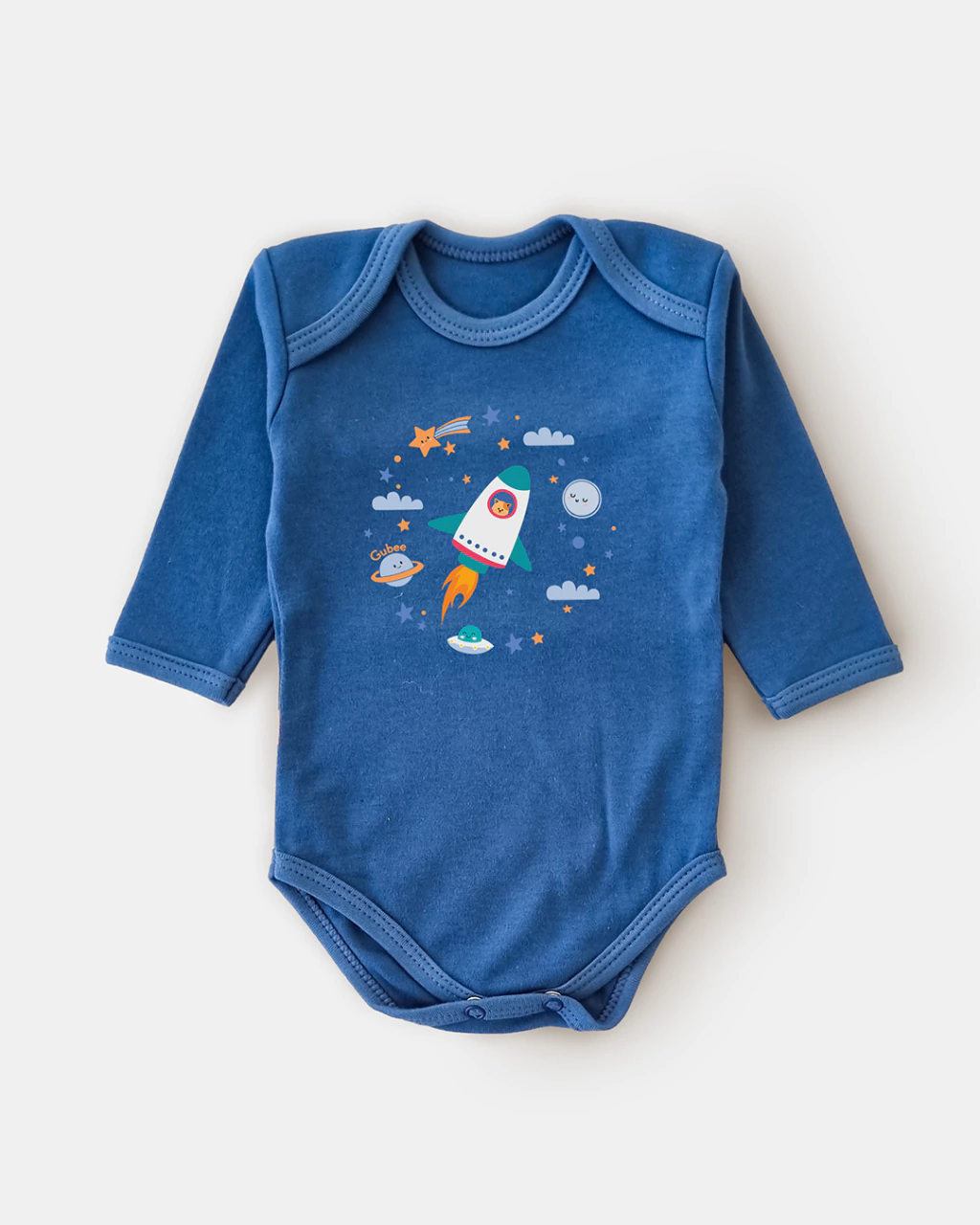 La estampa de cohete en el frente le da un toque lúdico y soñador, perfecto para los primeros meses de grandes aventuras.